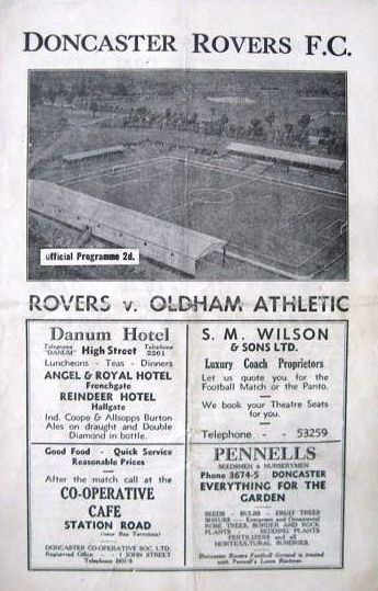 The Division Two game between Doncaster Rovers and Oldham Athletic on Friday 4th April 1947.«1946 - 1947 SeasonMore games against Oldham Athletic» the game Date: Friday 4th April 1947 Competition: Division Two Final Score: 4-2 Ground: Belle Vue programme