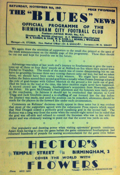 The Division Two game between Birmingham City and Doncaster Rovers on Saturday 8th November 1947.«1947 - 1948 SeasonMore games against Birmingham City» the game Date: Saturday 8th November 1947 Competition: Division Two Final Score: 3-0 Ground: St Andrews programme