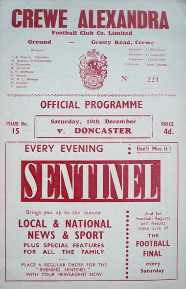 The Division Four game between Crewe Alexandra and Doncaster Rovers on Saturday 10th December 1960.«1960 - 1961 SeasonMore games against Crewe Alexandra» the game Date: Saturday 10th December 1960 Competition: Division Four Final Score: 1-1 Ground: Alexandra Stadium programme