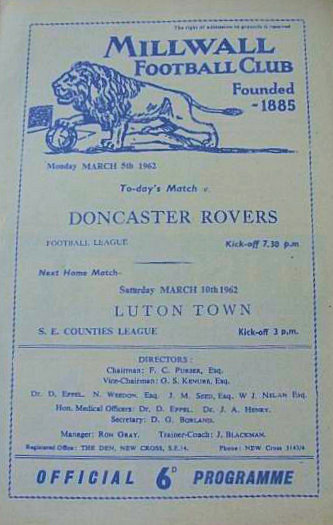 The Division Four game between Millwall and Doncaster Rovers on Monday 5th March 1962.«1961 - 1962 SeasonMore games against Millwall» the game Date: Monday 5th March 1962 Competition: Division Four Final Score: 2-0 Ground: The Old Den programme
