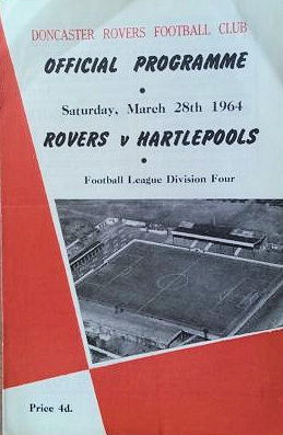 The Division Four game between Doncaster Rovers and Hartlepool United on Saturday 28th March 1964.«1963 - 1964 SeasonMore games against Hartlepool United» the game Date: Saturday 28th March 1964 Competition: Division Four Final Score: 2-2 Ground: Belle Vue programme