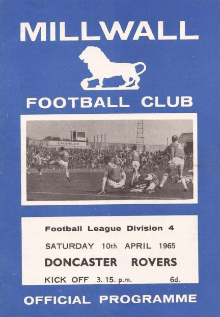 The Division Four game between Millwall and Doncaster Rovers on Saturday 10th April 1965.«1964 - 1965 SeasonMore games against Millwall» the game Date: Saturday 10th April 1965 Competition: Division Four Final Score: 1-1 Ground: The Old Den programme