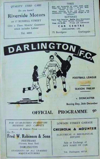 The Division Four game between Darlington and Doncaster Rovers on Thursday 26th December 1968.«1968 - 1969 SeasonMore games against Darlington» the game Date: Thursday 26th December 1968 Competition: Division Four Final Score: 0-0 Ground: Feethams programme