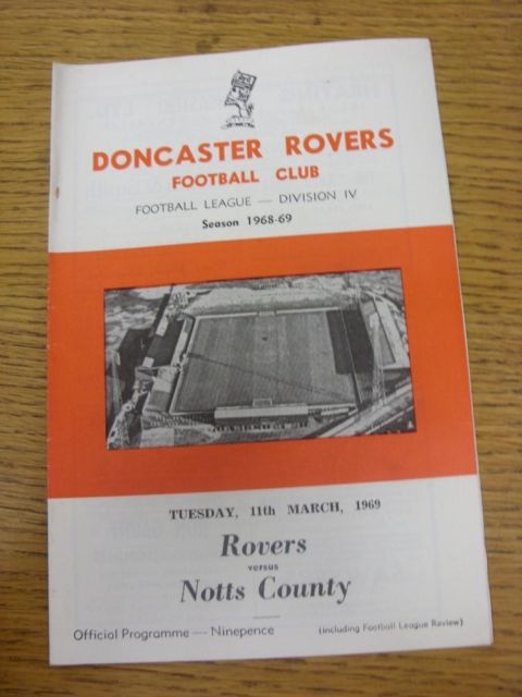 The Division Three game between Doncaster Rovers and Notts County on Tuesday 11th March 1969.«1968 - 1969 SeasonMore games against Notts County» the game Date: Tuesday 11th March 1969 Competition: Division Three Final Score: 0-0 Ground: Belle Vue programme