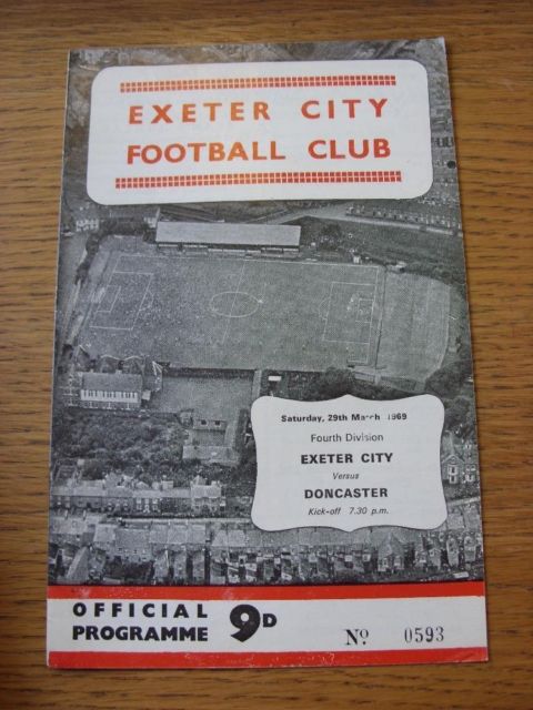 The Division Three game between Exeter City and Doncaster Rovers on Saturday 29th March 1969.«1968 - 1969 SeasonMore games against Exeter City» the game Date: Saturday 29th March 1969 Competition: Division Three Final Score: 0-0 Ground: St James Park, Exeter programme