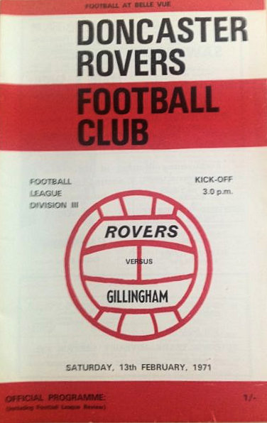 The Division Four game between Doncaster Rovers and Gillingham on Saturday 13th February 1971.«1970 - 1971 SeasonMore games against Gillingham» the game Date: Saturday 13th February 1971 Competition: Division Four Final Score: 2-2 Ground: Belle Vue programme