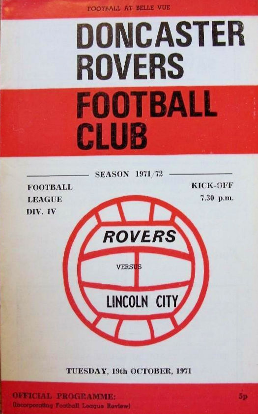 The Division Four game between Doncaster Rovers and Lincoln City on Tuesday 19th October 1971.«1971 - 1972 SeasonMore games against Lincoln City» the game Date: Tuesday 19th October 1971 Competition: Division Four Final Score: 2-0 Ground: Belle Vue programme