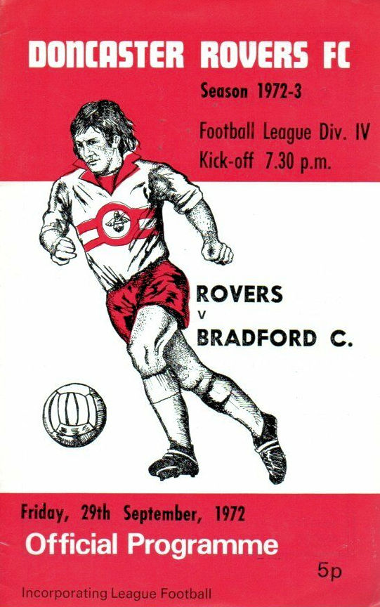 The Division Four game between Doncaster Rovers and Bradford City on Friday 29th September 1972.«1972 - 1973 SeasonMore games against Bradford City» the game Date: Friday 29th September 1972 Competition: Division Four Final Score: 1-0 Ground: Belle Vue programme