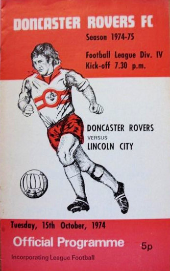 The Division Four game between Doncaster Rovers and Lincoln City on Tuesday 15th October 1974.«1974 - 1975 SeasonMore games against Lincoln City» the game Date: Tuesday 15th October 1974 Competition: Division Four Final Score: 2-2 Ground: Belle Vue programme