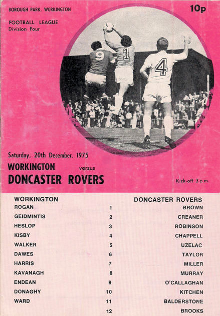 The Division Four game between Workington and Doncaster Rovers on Saturday 20th December 1975.«1975 - 1976 SeasonMore games against Workington» the game Date: Saturday 20th December 1975 Competition: Division Four Final Score: 3-1 Ground: Borough Park programme