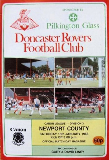 The Division Three game between Doncaster Rovers and Newport County on Saturday 18th January 1986.«1985 - 1986 SeasonMore games against Newport County» the game Date: Saturday 18th January 1986 Competition: Division Three Final Score: 1-1 Ground: Belle Vue programme