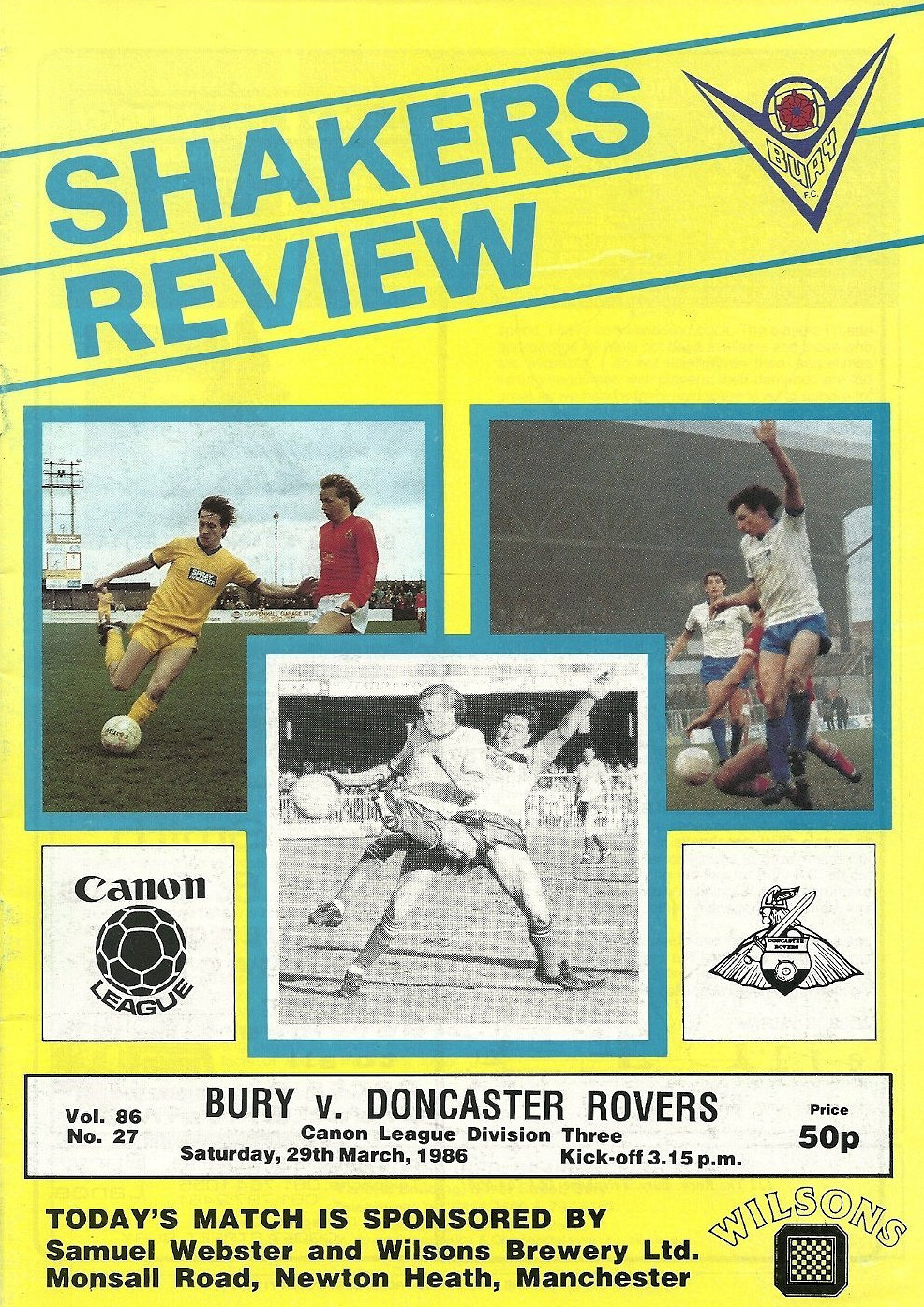 The Division Three game between Bury and Doncaster Rovers on Saturday 29th March 1986.«1985 - 1986 SeasonMore games against Bury» the game Date: Saturday 29th March 1986 Competition: Division Three Final Score: 1-2 Ground: Gigg Lane programme