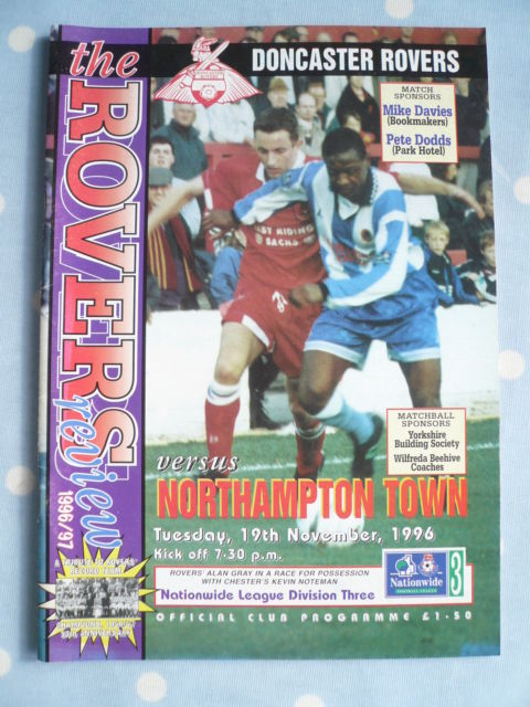 The Division Three game between Doncaster Rovers and Northampton Town on Tuesday 19th November 1996.«1996 - 1997 SeasonMore games against Northampton Town» the game Date: Tuesday 19th November 1996 Competition: Division Three Final Score: 1-2 Ground: Belle Vue programme