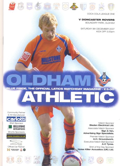 The League One game between Oldham Athletic and Doncaster Rovers on Saturday 8th December 2007.«2007 - 2008 SeasonMore games against Oldham Athletic» the game Date: Saturday 8th December 2007 Competition: League One Final Score: 1-1 Ground: Boundary Park programme
