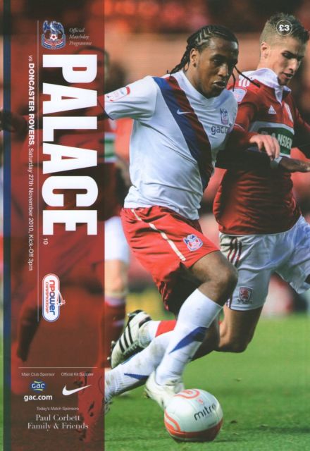 The Championship game between Crystal Palace and Doncaster Rovers on Saturday 27th November 2010.«2010 - 2011 SeasonMore games against Crystal Palace» the game Date: Saturday 27th November 2010 Competition: Championship Final Score: 1-0 Ground: Selhurst Park programme