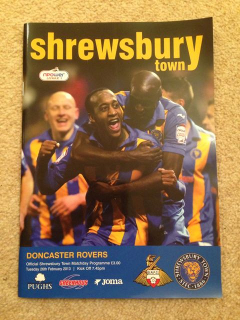 The Championship game between Shrewsbury Town and Doncaster Rovers on Tuesday 26th February 2013.«2012 - 2013 SeasonMore games against Shrewsbury Town» the game Date: Tuesday 26th February 2013 Competition: Championship Final Score: 1-2 Ground: New Meadow programme